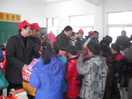 圖一:蔣美義(左一)和同事們一起向農(nóng)村小學(xué)捐書本文具