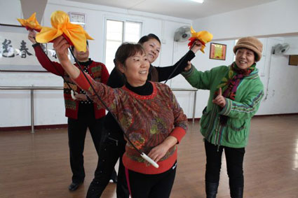 2014年1月12日下午,當(dāng)記者走進(jìn)朝陽(yáng)老年大學(xué)時(shí),10多位老人正隨著音樂節(jié)拍翩翩起舞,洋溢在臉上的笑容和優(yōu)美的舞姿,折射出老人愉快的心境。春節(jié)臨近,他們要到社區(qū)表演,此刻正在排練!疤梅浅:,就這樣保持下去!”一段舞蹈結(jié)束,老師彭斯惠帶頭鼓掌。