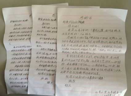 3月27日,山朱小學(xué)的一位老師帶著孩子們親手寫的感謝信來到報(bào)社,找到記者,想通過報(bào)紙向這群愛心人士表達(dá)孩子們最純真、最善良的感謝與祝福。老師對記者說,這群愛心人士在寒冷的冬天為孩子們送來新鞋子,讓這群孩子很感動,總想著要報(bào)答這些叔叔阿姨,因?yàn)楹⒆觽兊哪芰τ邢,老師商量著就讓孩子給這群叔叔阿姨寫封信吧,從一年級到六年級收到新鞋子的孩子都在學(xué)校工工整整地寫了信,表達(dá)了他們對叔叔阿姨的感激之情及收到禮物的喜悅之情。22個(gè)孩子22封信,雖然有的孩子年齡小,信的內(nèi)容不是很多,字也不是很漂亮,但他們的心是真誠的。后來,老師從中挑選了三封感謝信想寄給這群愛心人士,卻因?yàn)闆]有地址無法寄出,一直被神圣地鎖在老師的抽屜里。