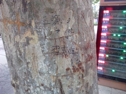 4月21日下午,記者在洞山中路看到,不少行道樹(shù)被涂畫(huà)或被用硬物刻劃過(guò),有的還被人割掉了一大截樹(shù)皮。在行道樹(shù)上留下的文字或是印痕中,多為一些姓氏和名字,有的則是涂寫(xiě)、刻錄者的“愛(ài)情宣言”,此外,還有一些詛咒他人的污言穢語(yǔ)。與此同時(shí),行道樹(shù)也受到了一些“辦證者”的青睞,“辦證”的小廣告在樹(shù)上占據(jù)了一席之地。