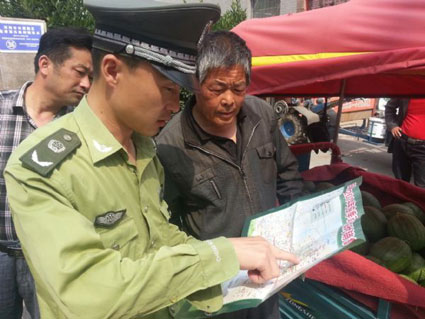 圖:執(zhí)法人員給瓜農(nóng)講解新版西瓜地圖銷售點(diǎn)布局 (照片由田家庵區(qū)城管行政執(zhí)法局提供)