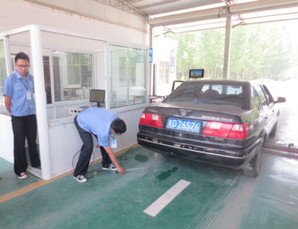 圖為工作人員正在對(duì)車輛進(jìn)行尾氣檢測(cè)。