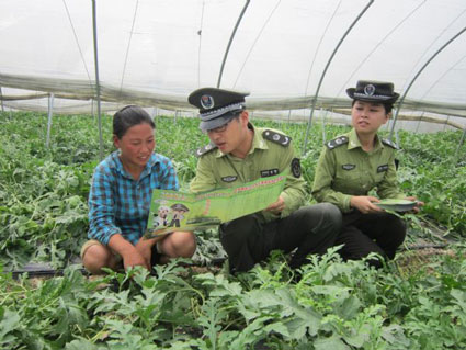 圖二:執(zhí)法人員走進田間地頭將“西瓜地圖”送到瓜農手中。