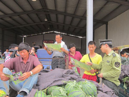 當天,城管執(zhí)法人員又來到曹庵鎮(zhèn)一處大型的福滿園農副產品交易市場,向瓜農攤販們散發(fā)“西瓜地圖”,受到了現(xiàn)場瓜農攤販們的熱烈歡迎。不一會,百余份“西瓜地圖”被搶要一空。
