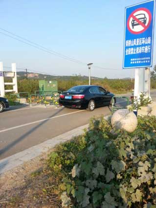 記者在現(xiàn)場看到,入口處設(shè)有活動閘口,閘口北側(cè)部分是可以活動的鐵欄桿,已被鎖鏈鎖上,而南側(cè)部分卻有兩米多寬,沒有設(shè)置障礙,車輛可以自由出入。在此入口處,記者看到,一輛黑色轎車停在入口處鐵欄旁,而一旁的路口完全敞開,不時有車輛從此經(jīng)過。記者觀察了10多分鐘,有5輛機動車經(jīng)過。在入口處設(shè)置了一個十分明顯的禁止機動車通行的標牌,且牌子上明確寫著“舜耕山風景區(qū)環(huán)山路全段禁止機動車通行”的字樣,然而一些駕駛員卻視而不見。