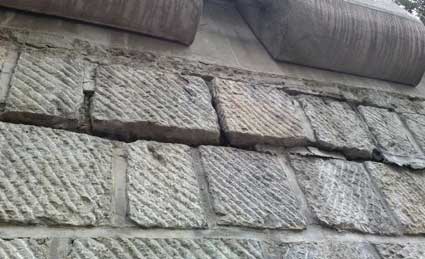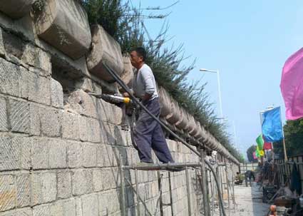 10月10日上午,記者在立交橋北段東側(cè)看到,工人們正在進(jìn)行該側(cè)擋土墻的維修工作。作業(yè)場(chǎng)所被圍上,并用標(biāo)語(yǔ)提醒市民經(jīng)過(guò)注意安全。在作業(yè)區(qū),施工人員站在腳手架上,利用專(zhuān)業(yè)工具風(fēng)鎬把擋土墻上部的一些大石塊一一破碎,清理后在墻上留下一個(gè)長(zhǎng)方形的槽。在槽里面安裝上H型鋼,再澆灌混凝土,然后外側(cè)用鋼板封住。從外側(cè)看,就像給立交橋打了一個(gè)長(zhǎng)補(bǔ)丁一樣。雖然暫時(shí)不太雅觀,但給人以很牢固的感覺(jué)。記者發(fā)現(xiàn),目前立交橋南段的兩側(cè)擋土墻的“補(bǔ)丁”已經(jīng)全部完工,而北段西側(cè)尚未施工。記者在尚未施工的擋土墻跟前仔細(xì)觀察,發(fā)現(xiàn)墻面不少裂縫,一些石塊可能是由于長(zhǎng)時(shí)間的受力,已經(jīng)從墻體凸起來(lái),大約有兩個(gè)手指的寬度,給人以確實(shí)存在安全隱患的直觀印象。
