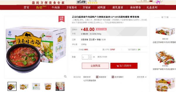 3月28日,記者點開國內(nèi)兩大網(wǎng)購平臺:淘寶網(wǎng)和京東商城,看到在這兩個網(wǎng)站上,均有淮南牛肉湯在售。打開售賣淮南牛肉湯的鏈接網(wǎng)頁,記者看到各家的網(wǎng)頁都裝飾的非常精美,特別是頁面上掛著的大碗牛肉湯“寫真”,讓人看后直吞口水,忍不住有拍下來的沖動。除了制作精美的網(wǎng)頁之外,各售賣淮南牛肉湯的店家,還針對全國各地人們不同的飲食習(xí)慣,細心周到地列出了關(guān)于口味的提醒事項:“淮南牛肉湯方便裝目前有原味和香辣兩種口味,原味是微辣的,香辣味要更加辣一些,能吃辣的親們建議選擇香辣味,不太能吃辣的親們建議選擇原味哦!