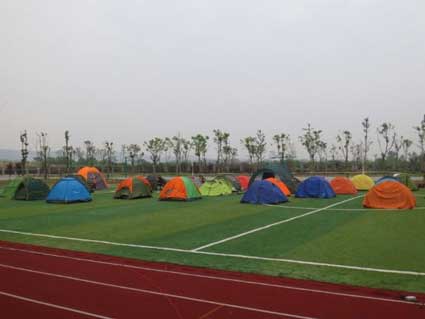 圖一:操場(chǎng)上搭起了一頂頂帳篷,這就是孩子們晚上臨時(shí)的“家”。