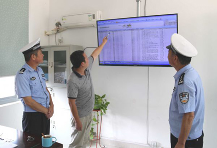 圖:民警查看;菲髽I(yè)車輛GPS實(shí)時(shí)定位情況。