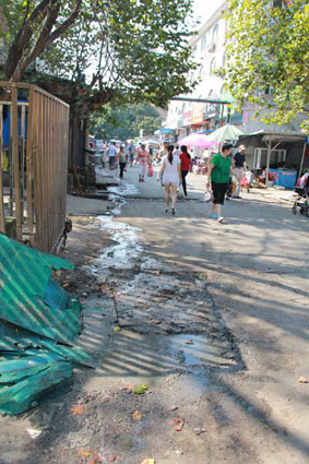 圖為基地菜市西側(cè)道路污水遍地惡臭熏人。