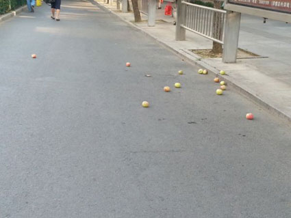 9月14日,在人民南路市體育中心西門北側(cè)的非機動車道上散落一地蘋果,過往市民看見紛紛撿拾拿走。經(jīng)過詢問,原來是賣水果者自己將蘋果扔在路面上一走了之,經(jīng)過市民看見覺得非?上В瑢⑤^好的蘋果撿起。