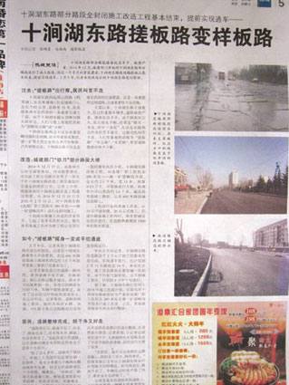 十澗湖東路分段整修改造。十澗湖東路部分路段坑洼不平、破損嚴(yán)重。由于路面灰塵大、雨天排水不暢,經(jīng)常是“晴天一身灰,雨天一身泥”,生活在此路兩邊的居民苦不堪言,過路司機(jī)叫苦不迭。人們形象地稱該路為“搓板路”、“灰塵路”、“水泥路”,希望道路整修的呼聲不斷,早報(bào)熱線多次對(duì)此事進(jìn)行報(bào)道。2014年12月,城建部門開始對(duì)十澗湖東路進(jìn)行分段整修改造。早報(bào)熱線第一時(shí)間進(jìn)行了關(guān)注和報(bào)道。在十澗湖東路(選煤廠職工醫(yī)院東280米處至謝一礦望峰崗井段)改造完工通車,2015年2月12日,早報(bào)熱線以《十澗湖東路搓板路變樣板路》為題進(jìn)行了報(bào)道,及時(shí)向市民傳遞路面狀況和通車信息。
