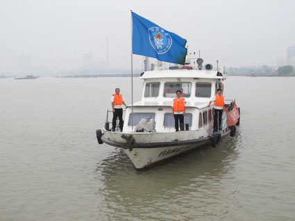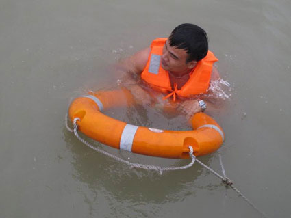圖四:漁政人員拋下救生圈施救逃生落水漁民。