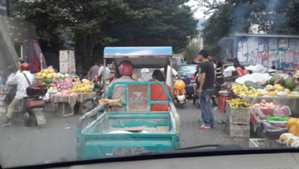 圖:道路兩邊擺放著各種攤位,道路顯得比較擁堵。(圖為網(wǎng)友開(kāi)車經(jīng)過(guò)時(shí)拍攝的照片)
