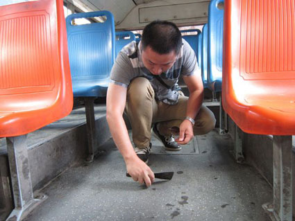28日一大早,在淮南中北巴士有限公司客運(yùn)二車隊(duì)停車場(chǎng),3路車駕駛員平多芮就忙著打掃車廂里的衛(wèi)生。在車內(nèi),記者看到,經(jīng)過打掃,車廂里環(huán)境衛(wèi)生變得干凈,不過,地板上卻存在不少黑點(diǎn)!斑@是乘客吃過扔下的口香糖,被踩得黑乎乎的,很難清理。”平多芮邊說著,邊用手里的小鏟子一點(diǎn)一點(diǎn)地鏟除。