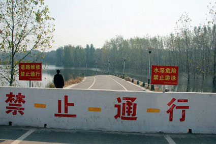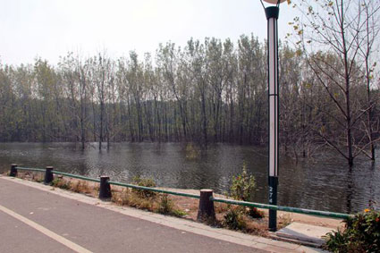 近日,記者來到市民反映的被淹地段,該地段位于淮舜南路東側(cè)、大通濕地公園東北側(cè)。在現(xiàn)場記者看到,此處的環(huán)山路部分路面和景觀路燈都浸泡在水中,道路已經(jīng)被一道磚墻完全封閉,并且懸掛了“水深危險(xiǎn),禁止游泳”和“道路維修禁止通行”的警示標(biāo)牌。而環(huán)山路南面大面積的林地已被水淹沒。是什么原因?qū)е略摰囟瓮蝗槐谎?而水又長期不退呢?記者找到了大通區(qū)人大副主任鄒用德。