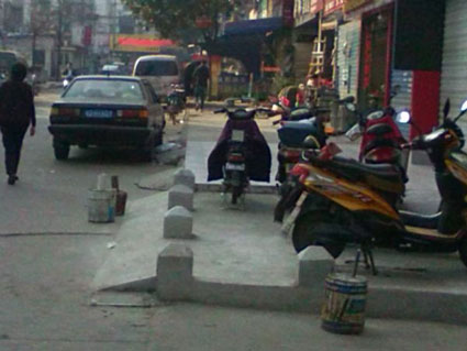 為了防止司機(jī)在門前亂停車,位于田家庵區(qū)華聲苑小區(qū)北門的一家沿街店鋪將人行道用水泥墊平,并在店鋪的周圍砌了多個(gè)水泥墩。由于該店鋪門前是人行道,夜晚時(shí)光線差,給行人帶來了一些安全隱患。