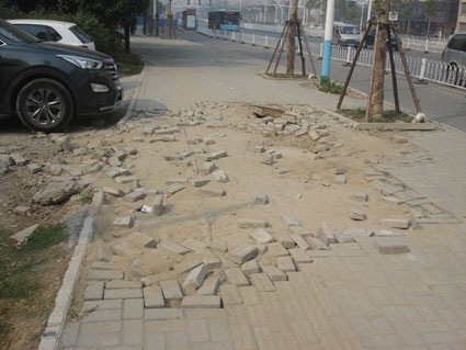 記者來到了張先生反映的朝陽東路領城小區(qū)門前的這段人行道,記者發(fā)現(xiàn)大約50平方的人行道出現(xiàn)了不同的破損,露出了當時鋪設人行道地磚所用的沙石,大量的沙石隨處灑落在路面上,過往的行人都選擇繞行。
