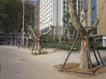 11月2日,記者在淮南火車站北邊海沃世貿(mào)商城旁看到,5棵新栽的法梧已矗立在路邊,園林部門正對其進行精心養(yǎng)護!斑@5棵法梧直徑約40厘米,樹齡也都在40年左右,和之前移走的法梧差不多!被茨鲜袌@林局園林設(shè)施管理大隊相關(guān)負責(zé)人表示,“也就最近幾天才栽好的,栽好后將加強養(yǎng)護和保護,確保樹木成活,生根發(fā)芽!