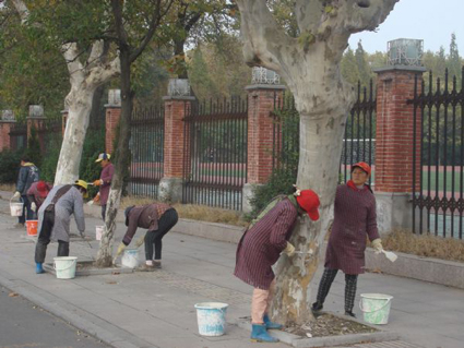 圖為:在淮河大道上,園林養(yǎng)護工人用“涂白”的方式給樹木擦“護膚霜”。