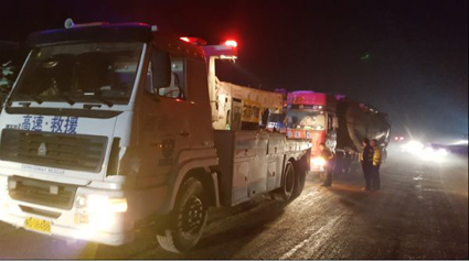 圖二:執(zhí)法人員用拖車將人為破壞的疑似超限超載灰罐車拖到淮南東超限超載監(jiān)測站進(jìn)行地磅。