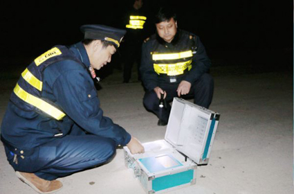 圖一:執(zhí)法人員用便攜式稱重車輛超限檢測儀對汽車進(jìn)行稱重。