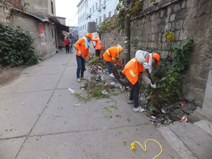 圖:環(huán)衛(wèi)工人正在清理八區(qū)七小門前道路沿線垃圾雜物。