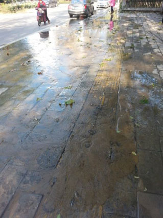 接報后,記者隨后趕到現(xiàn)場。在現(xiàn)場,記者看到,在老龍眼路與洞山中路交叉丁字路口出現(xiàn)一片積水。順著水流,記者在離路口約50米處的老龍眼路東側(cè)人行道上,看到不斷有清水從人行道板下冒出,水流攜著泥沙順著路面流到低洼處。
