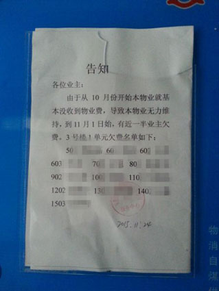 北京名都小區(qū)物業(yè)管理方為安徽方舟物業(yè)公司;春釉鐖、淮南報業(yè)新聞網(wǎng)記者在3號樓一單元電梯口看到由方舟物業(yè)辦張貼的兩張通知,一張是關于水費的通知,一張是關于物業(yè)費的通知。關于水費的通知上寫道“9-10月份水費尚有一大部分業(yè)主未繳,望未繳水費的業(yè)主于11月30日前到物業(yè)辦繳納水費,逾期不繳,后果自負!甭淇顣r間為“2015年11月27日”。而在關于物業(yè)費的通知上寫到“由于從10月份開始本物業(yè)就基本沒有收到物業(yè)費,導致本物業(yè)無力維持,到11月1日,有近一半業(yè)主欠費!辈⒘谐3號樓一單元欠費業(yè)主的名單。