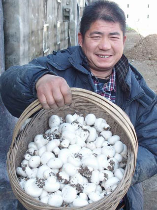 圖三:蘑菇增產(chǎn),菇農(nóng)樂開懷。