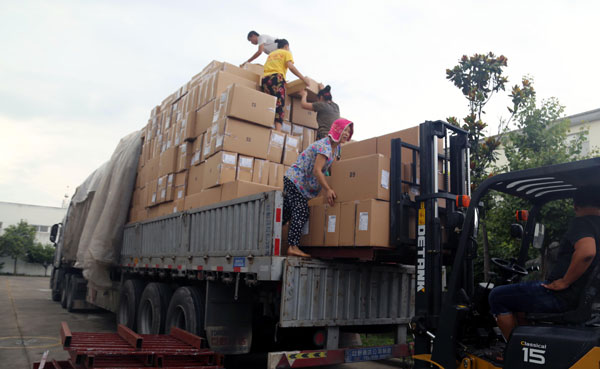 圖一:8月10日,“國奧”廠區(qū)內滿滿一車乒乓球拍即將發(fā)往法國