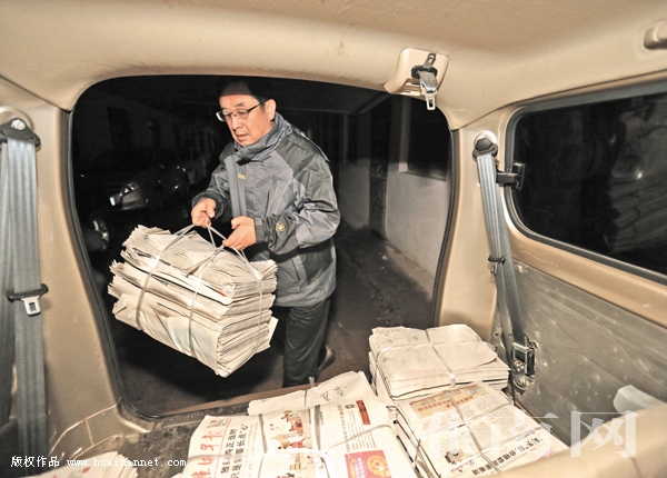 圖七:天微微亮,發(fā)行車已經(jīng)上路,將《淮南日報》《淮河早報》運往每一個區(qū)縣,每一家單位,每一個社區(qū),及時送到讀者手上。