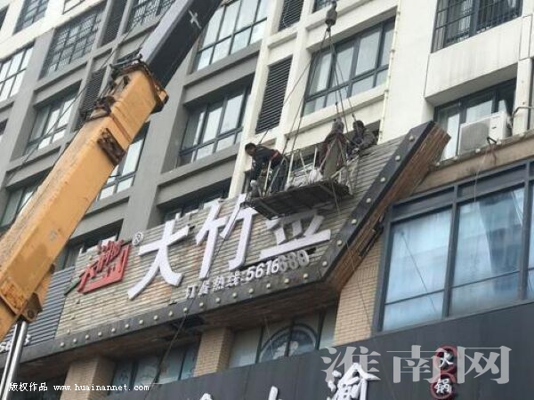 19日上午9時許,淮河早報、淮南網(wǎng)記者驅(qū)車來到了位于學院南路的金大地龍湖中心,看到拆除現(xiàn)場及四周已被城管部門拉起的警戒線圍了起來,10余名田區(qū)城管行政執(zhí)法隊員頭戴安全帽正在實施拆除行動。在執(zhí)法隊員的指揮下,一輛大型起吊機載著數(shù)名工人正在進行高空作業(yè),只見工人們先用氣焊切割機對高樓外立面的戶外廣告牌進行人工拆分,再用機械運輸移送至地面,拆除現(xiàn)場緊張忙碌但井然有序。