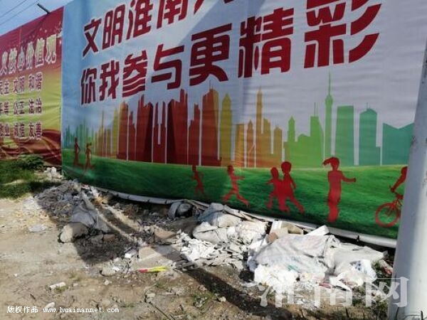 在民惠街西段泉山湖小區(qū)附近路邊,存在偷倒建筑裝修垃圾現(xiàn)象(如圖),且垃圾越來越多,與一旁的文明宣傳形成強烈反差,希望相關部門加強管理。(記者)