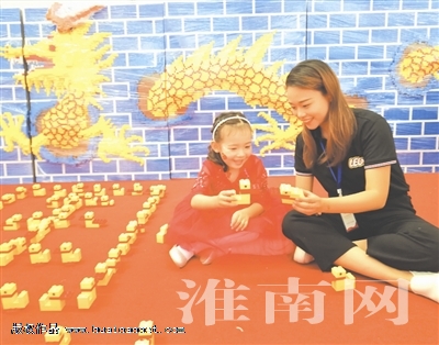 圖為創(chuàng)意中心的老師正帶著孩子玩得不亦樂乎。