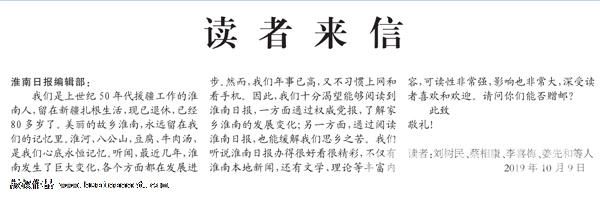 今天,淮南日?qǐng)?bào)編委會(huì)決定拿出寶貴的頭版版面,刊發(fā)這封來(lái)自祖國(guó)邊疆的讀者來(lái)信。(見(jiàn)上圖)