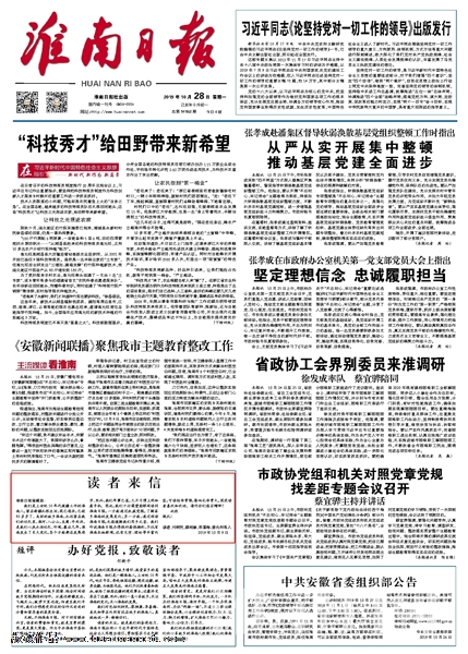 讀者的關(guān)注,就是我們的奮進(jìn)動(dòng)力;茨先?qǐng)?bào)社將以習(xí)近平新時(shí)代中國(guó)特色社會(huì)主義思想為指引,貫徹落實(shí)習(xí)近平新聞?shì)浾撍枷,在市委?jiān)強(qiáng)領(lǐng)導(dǎo)下,在市委宣傳部指導(dǎo)下,聚焦新發(fā)展理念,緊緊圍繞市委、市政府中心工作和全市發(fā)展大局,唱響五大發(fā)展美好淮南主旋律,傳遞五大發(fā)展美好淮南正能量。