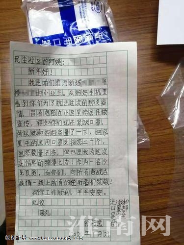 收到這樣暖暖的感謝信和口罩,民生社區(qū)黨支部書記童春芳十分感動。她說,郭茹逸曾多次參加小區(qū)的文明創(chuàng)建志愿服務(wù)活動,是社區(qū)里一名優(yōu)秀的小志愿者。此次疫情防控工作得到住戶的理解和支持,讓大家更有動力和信心打贏疫情防控阻擊戰(zhàn)。而談到這次送口罩,郭茹逸的媽媽說:“我們現(xiàn)在基本都是待在家里,口罩夠用,還有多的,正好在微信里看到社區(qū)工作人員因為要長時間在外工作,口罩比較緊缺,于是一家人就決定,把口罩送給需要的人!眻D為滿滿暖意的感謝信。