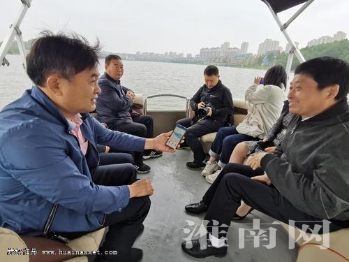 圖:嶺南村泉山湖河長向大店村有關負責人介紹巡查湖面網(wǎng)上打卡工作經(jīng)驗。