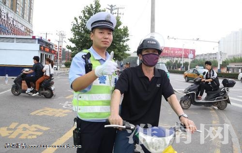 圖為6月17日下午田家庵二大隊(duì)輔警向佩戴頭盔的市民伸手點(diǎn)贊。(記者 蘇國義)