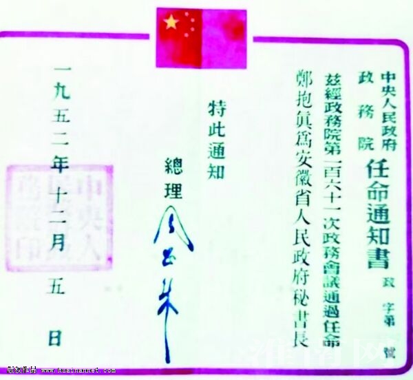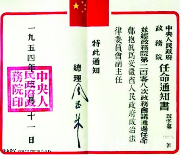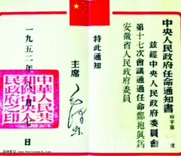 顧全大局不計名利。鄭抱真是一個胸懷坦蕩、淡泊名利的黨的高級干部。1949年4月,經(jīng)毛澤東主席簽署,任命鄭抱真為皖北行署副主任(副省級),負責(zé)皖北行署的常務(wù)工作。1952年中央人民政府決定,皖南、皖北行署合并成立安徽省人民政府。由于省級干部職數(shù)限制,加之還要安排一些民主黨派和無黨派人士任職,所以,鄭抱真被任命為省人民政府委員會委員兼秘書長。他顧全大局,毫不計較名利和地位,自覺服從黨的決定和革命工作的需要,愉快地服從,不講價錢。在主持省政府機關(guān)日常事物期間,工作開展得有聲有色,井井有條。與他相識多年的省委副書記李世農(nóng)這樣評價他:“組織讓他干啥就干啥,從不講價錢,放到哪里都讓人放心,都踏踏實實地干工作,是個好干部!