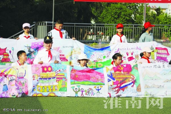5月8日,在八公山區(qū)第五中學(xué)運動場上,來自該區(qū)各校的100名學(xué)生在100米長的畫布上全神貫注地書畫,抒發(fā)愛黨愛國情懷,用100副書畫作品向中國共產(chǎn)黨成立100周年獻禮。(通訊員 施雅雯)