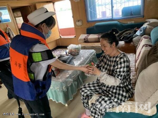 圖:交通執(zhí)法支隊的執(zhí)法人員為船民送藥上船
