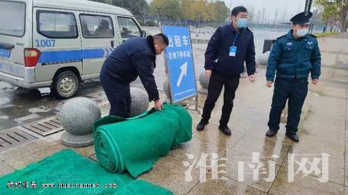 圖為淮南東站綜管中心在出站口到地下停車場的路段鋪設地毯,防止地面濕滑給旅客帶來不便。