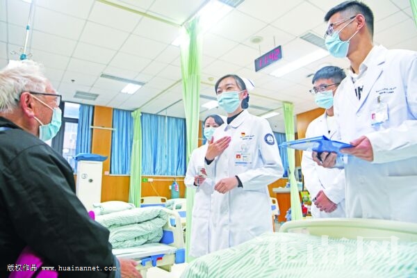 黨的二十大代表、安徽理工大學第一附屬醫(yī)院(市第一人民醫(yī)院)日間醫(yī)療管理中心副主任、護士長夏曉丹(右三)在與患者家屬交流黨的二十大報告中關于推進健康中國建設內(nèi)容。夏曉丹返回工作崗位后,通過與同事、患者以及家屬交流報告中關于深化醫(yī)藥衛(wèi)生體制改革、促進優(yōu)質(zhì)醫(yī)療資源擴容、加強重大慢性病健康管理、壯大醫(yī)療衛(wèi)生隊伍等內(nèi)容,熱議健康中國建設話題。連日來,我市各地迅速掀起學習宣傳貫徹黨的二十大精神熱潮。 (記者 陳 彬 攝)