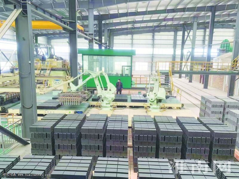 日前,記者走進(jìn)淮南東辰集團(tuán)國(guó)家級(jí)大宗煤電固廢物綜合利用產(chǎn)業(yè)集聚基地——鳳臺(tái)縣丁集產(chǎn)業(yè)園區(qū)淮南博羅環(huán)保建材有限公司雄淮分公司生產(chǎn)車(chē)間,看到伴隨著機(jī)器的“咔咔”聲,多臺(tái)智能碼磚機(jī)器人正井然有序地將傳輸帶上的磚坯子搬運(yùn)至旋轉(zhuǎn)隧道窯軌道內(nèi)碼列整齊,等待燒結(jié)成磚。