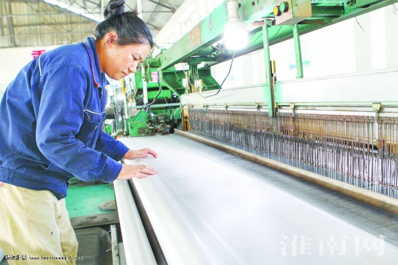 圖為安徽東浙盛科技公司工人在2800MM大寬幅滌綸長絲風(fēng)筒基布織布機前察看成品質(zhì)量。 (記者 陳海濤 攝)