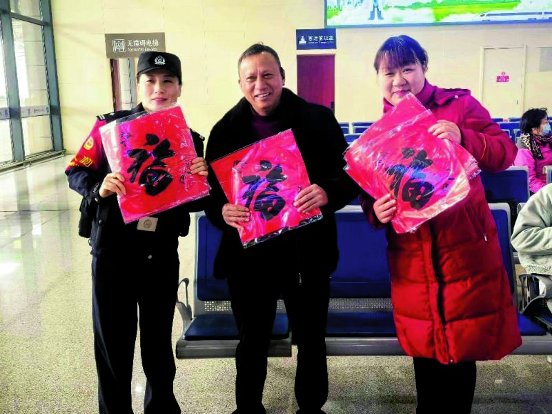 活動現(xiàn)場,工作人員將滿載新春祝福的春聯(lián)送到旅客手中,收到春聯(lián)的李大爺高興地說:“車站送春聯(lián)就是有年味,讓我還沒到家,就感受到了溫暖!