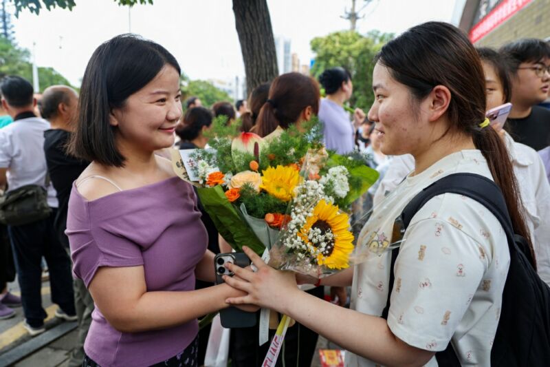 6月7日,一位學生家長用鮮花迎接走出考場的孩子。