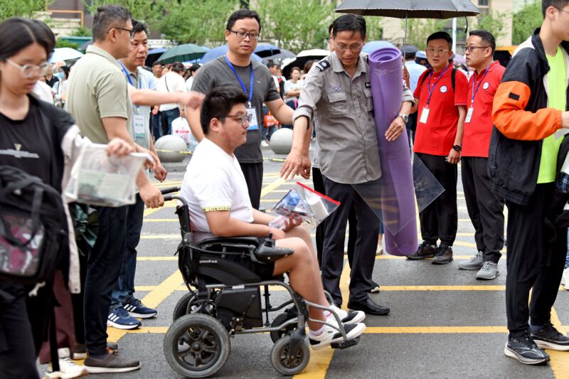(記者 付莉榮)6月7日,在淮南實驗中學(xué)山南一中考點門前,一名在家人陪伴下坐輪椅堅持來考試的考生引起了記者的注意?键c老師和工作人員協(xié)助將考生送進考場。據(jù)了解,這名考生在考試前腰部受傷,提前向考點申請,該校單獨為其設(shè)置了一樓特殊考場,方便其參加考試。